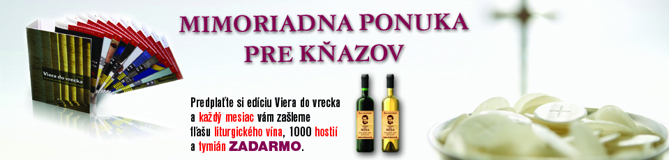 Rozhodli sme sa pripraviť kňazom a farnostiam túto zaujímavú ponuku: každý mesiac Vám pošleme zadarmo 1000 ks hostií, 0,7 l fľašu kvalitného omšového vína a 30 g tymianu. Stačí, ak PREDPLATÍTE do Vašej farnosti aspoň 30 ks predplatného edície Viera do vrecka na rok 2015 alebo každý mesiac KÚPITE do Vašej farnosti aspoň 40 ks brožúr z edície Viera do vrecka.
